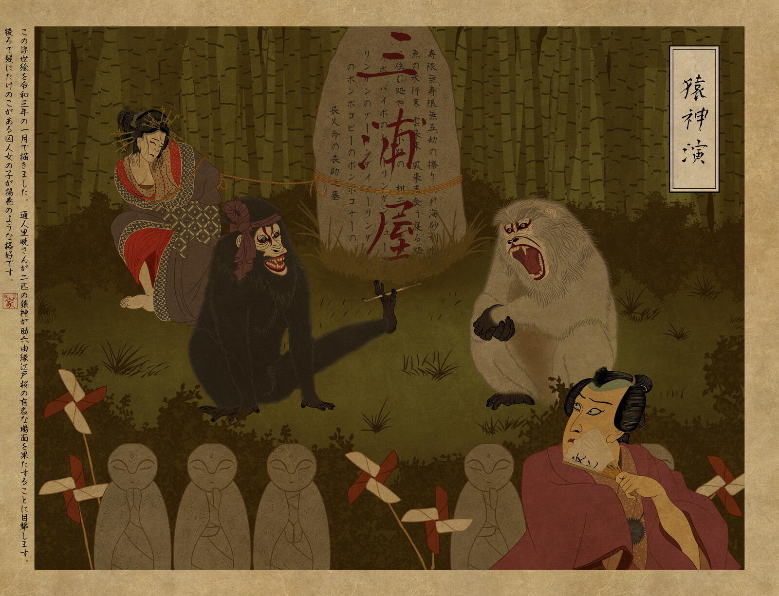 ในจังหวัดโอคายามะ มีลิงยักษ์ตัวหนึ่งอาศัยอยู่บนภูเขา ทุกปีมันจะเรียกร้องหญิงสาวหนึ่งคนจากหมู่บ้านรอบหุบเขา จนกระทั่งถึงคิวของหญิงสาวคนหนึ่งที่ครอบครัวเศร้าเสียใจกับการเสียสละของเธอเป็นอย่างมาก ทำให้นายพรานเกิดความเห็นใจและอาสาที่จะเป็นเครื่องสังเวยแทน