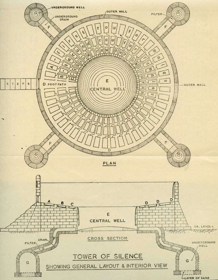 หอคอยแห่งความเงียบ (Tower of Silence) จะถูกสร้างอย่างค่อนข้างสม่ำเสมอ โดยมีหลังคาเกือบแบนมีเส้นรอบวงจะมีความสูงกว่าจุดศูนย์กลางเล็กน้อย ในส่วนของหลังคาจะถูกแบ่งออกเป็นสามวงกลม โดยแต่ละวงถูกใช้กับกลุ่มบุคคลที่มีความแตกต่างกัน ดังต่อไปนี้