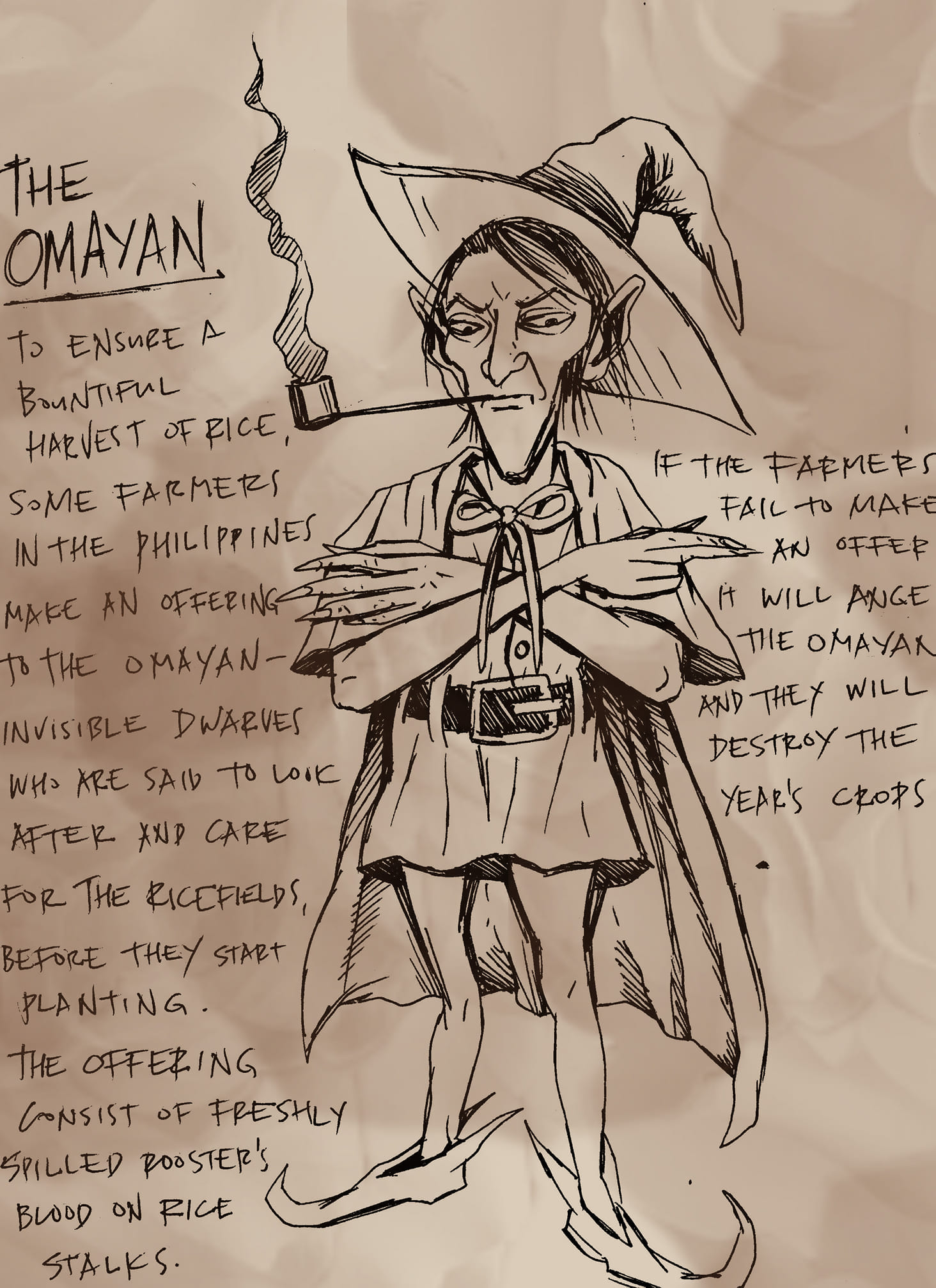 “โอมายัน” (Omayan) เป็นคนแคระล่องหนที่ทำหน้าคอยดูแลทุ่งข้าว ชาวนาบางคนในประเทศฟิลิปปินส์จะทำการถวายเครื่องเซ่นบูชาให้กับพวกมันเพื่อให้ช่วยดูบำรุงทุ่งนาให้มีความอุดมสมบูรณ์ ซึ่งประกอบไปด้วยเลือดของไก่สดโดยพรมเอาไว้บนต้นข้าวก่อนที่จะทำการปลูก เชื่อกันว่าหากไม่ทำการเซ่นไหว้โอมายันอย่างเหมาะสมก็จะทำให้พวกมันโกรธและทำลายพืชผลของปีนั้นจนย่อยยับ...