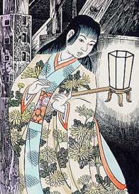 ในสมัยเอโดะ มีชายหนุ่มคนหนึ่งชื่อ “โมริตะ ซุยโช” อยากที่จะเห็นว่ามีภูตผีอาศัยอยู่ชั้นบนของปราสาทฮิเมจิจริงหรือเปล่า เขารอจนกระทั่งพลบค่ำแล้วถือโคมไฟกระดาษแล้วแอบปีนขึ้นไปพร้อมกับจินตนาการว่าภูตผีที่สิงสถิตอยู่ในปราสาทจะมีรูปร่างหน้าตาอย่างไรและจะเกิดอะไรขึ้นถ้ามันมีตัวตนอยู่จริงๆ จนกระทั่งถึงชั้นบนสุดในที่สุดเขาก็เห็นแสงจางๆ จากประตูบานหนึ่งในห้องใต้หลังคาที่ชวนให้สงสัย เขาจึงได้แอบไปมองว่ามีใครอยู่ข้างในกันแน่ ในตอนนั้นเองที่มีเสียงผู้หญิงคนหนึ่งถามขึ้นมาว่า “ใครอยู่ที่นั่น!”