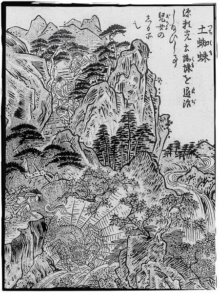 นักรบในตำนานของประเทศญี่ปุ่นอย่าง “มินาโมโตะ โนะ โยริมิตสึ” มีการเผชิญหน้ากับสึชิกุโมะหลายครั้ง เช่น ครั้งหนึ่งสึชิกุโมะได้จำแลงกายมาเป็นเด็กรับใช้หมายวางยาพิษโยริมิตสึ ส่งผลทำให้บาดแผลไม่สมานและยารักษาก็ไม่ได้ผล ตอนนั้นเองที่เขาสงสัยว่าตัวเองถูกวางยาจึงได้ใช้ดาบฟันใส่เด็กรับใช้ การฟันนั้นได้ทำลายภาพลวงตาอันทรงพลังและพบว่าร่างของเขาเองถูกห่อหุ้มด้วยใยแมงมุม เขากับผู้ติดตามได้ตามรอยเลือดของสึชิกุโมะที่หนีเข้าไปในป่า จนถึงภูเขาแห่งหนึ่ง ที่นั่นเขาพบซากของแมงมุมขนาดมหึมานอนเสียชีวิตจากบาดแผลที่เกิดขึ้นจากดาบ