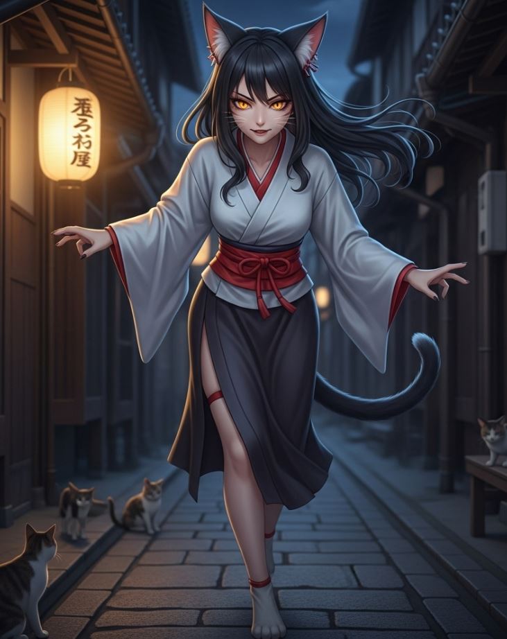 เนโกะมุสสึเมะ (Nekomusume) ภูตผีของประเทศญี่ปุ่น ได้รับการอธิบายเอาไว้ว่าเป็นหญิงสาวที่มีลักษณะของแมว ดวงตาเฉียบคมเปล่งประกายเหมือนแมว หูแหลมคม มีหางแมวแกว่งไหวเบา ๆ อยู่ด้านหลัง มันมีทั้งความเมตตาและความอาฆาตพยาบาท บางตนอาจนำพาโชคดีมากมอบให้ ในขณะที่บางตนนำพาโชคร้ายและความสิ้นหวัง ซึ่งพฤติกรรมของมันถือว่าคาดเดาได้ยาก