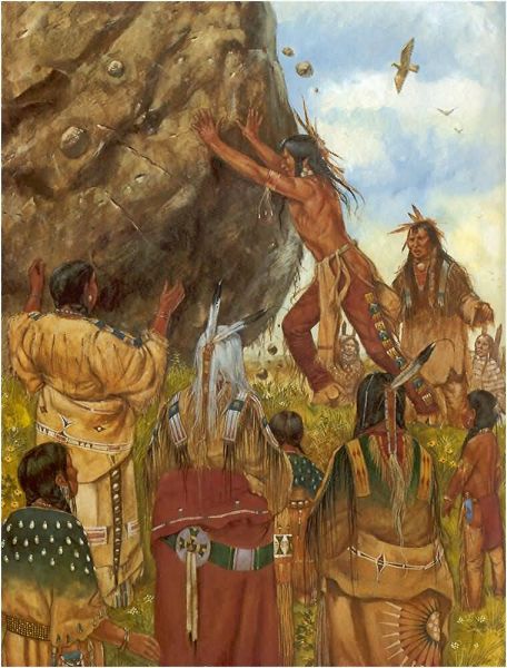 ครั้งหนึ่งเคยมีสิ่งมีชีวิตที่ถูกเรียกว่า “หญิงแดง” (Red-Woman) ผู้หญิงชั่วร้ายที่เดินเตร่อยู่ในที่ราบ วันหนึ่งมันได้เข้าไปในกระท่อมของสามีภรรยาคู่หนึ่งที่ขณะที่สามีออกไปล่าสัตว์ เธอลงมือสังหารภรรยาและผ่าท้องออกภายในนั้นปรากฏว่าเด็กแฝดคู่หนึ่งกำลังเติบโตอยู่