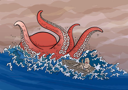 ในวันที่แปด เขาตั้งใจที่จะตัดหนวดอันสุดท้ายเหมือนกับทุกครั้งที่ผ่านมา แต่คราวนี้เจ้าปลาหมึกยักษ์กลับตื่นขึ้นมาอย่างกะทันหันและโกรธเกรี้ยวอย่างมาก มันใช้หนวดที่เหลือเพียงอันเดียวพันรอบร่างของเขาแล้วไถลลงไปที่ก้นทะเล หลังจากนั้นที่จัดการมนุษย์ที่มารบกวนมันเสร็จมันก็งีบหลับต่ออีกครั้ง