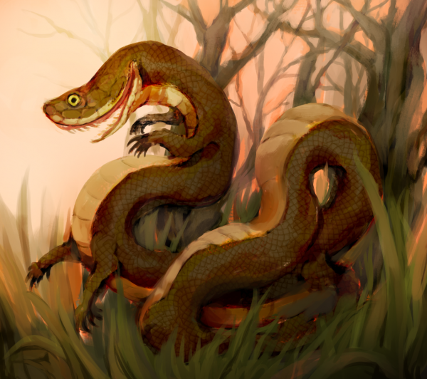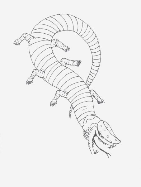 ทันใดนั้นเอง สิ่งมีชีวิตประหลาดที่มีรูปร่างคล้ายกับงูก็ได้กระโดดออกมาจากพงหญ้าและจู่โจมเขา มันมีหกขา ปลายเท้ามีหกนิ้ว ลำตัวยาวกว่า 10 เมตร มันเลื้อยที่คอและพยายามกัดหัวของเขา โชคดีของชายหนุ่มที่พกเคียวตัดหญ้ามาด้วย เขาเลยใช้มันตัดคอสิ่งมีชีวิตประหลาดจนรอดพ้นจากความตายมาได้สำเร็จ